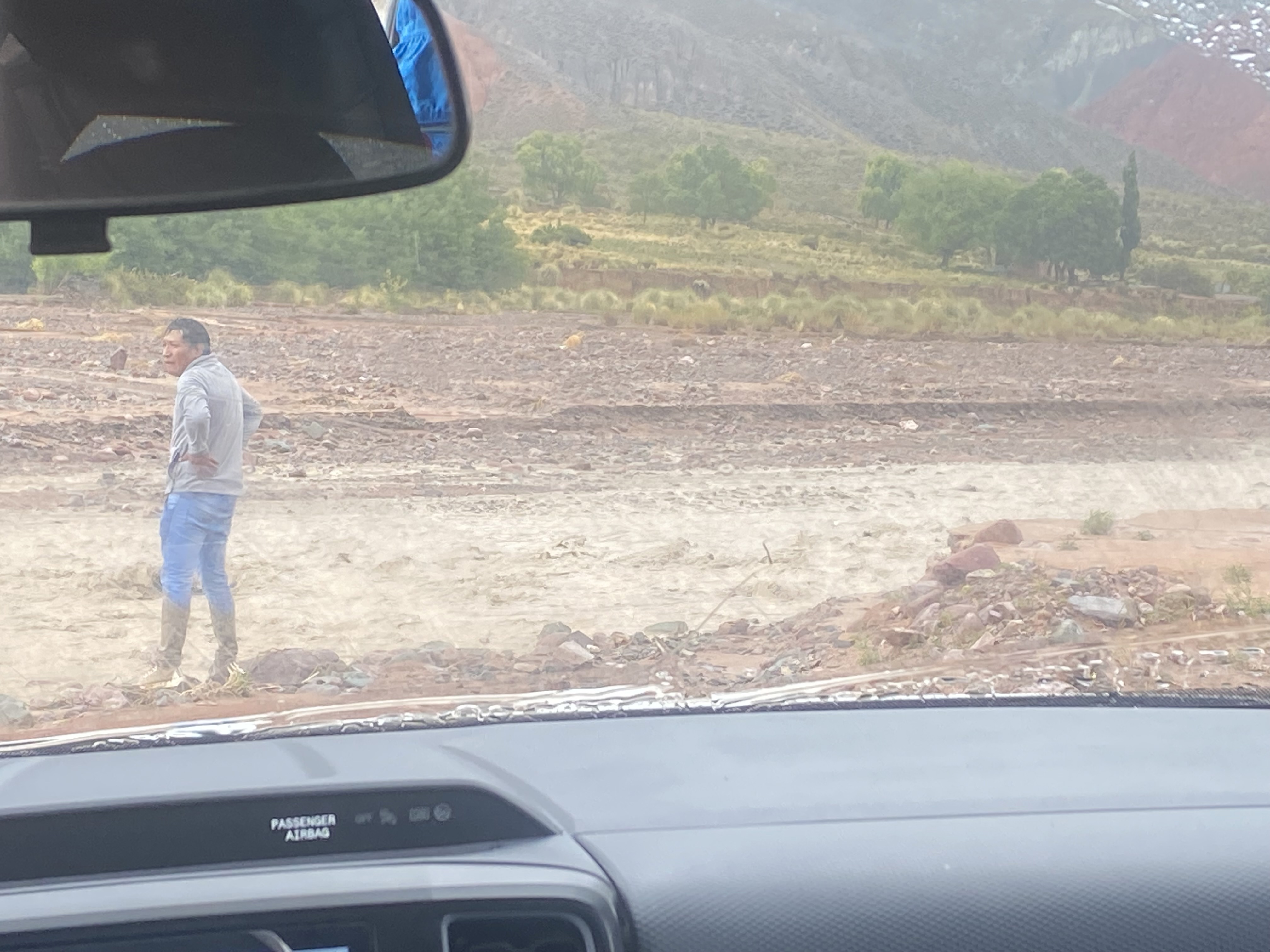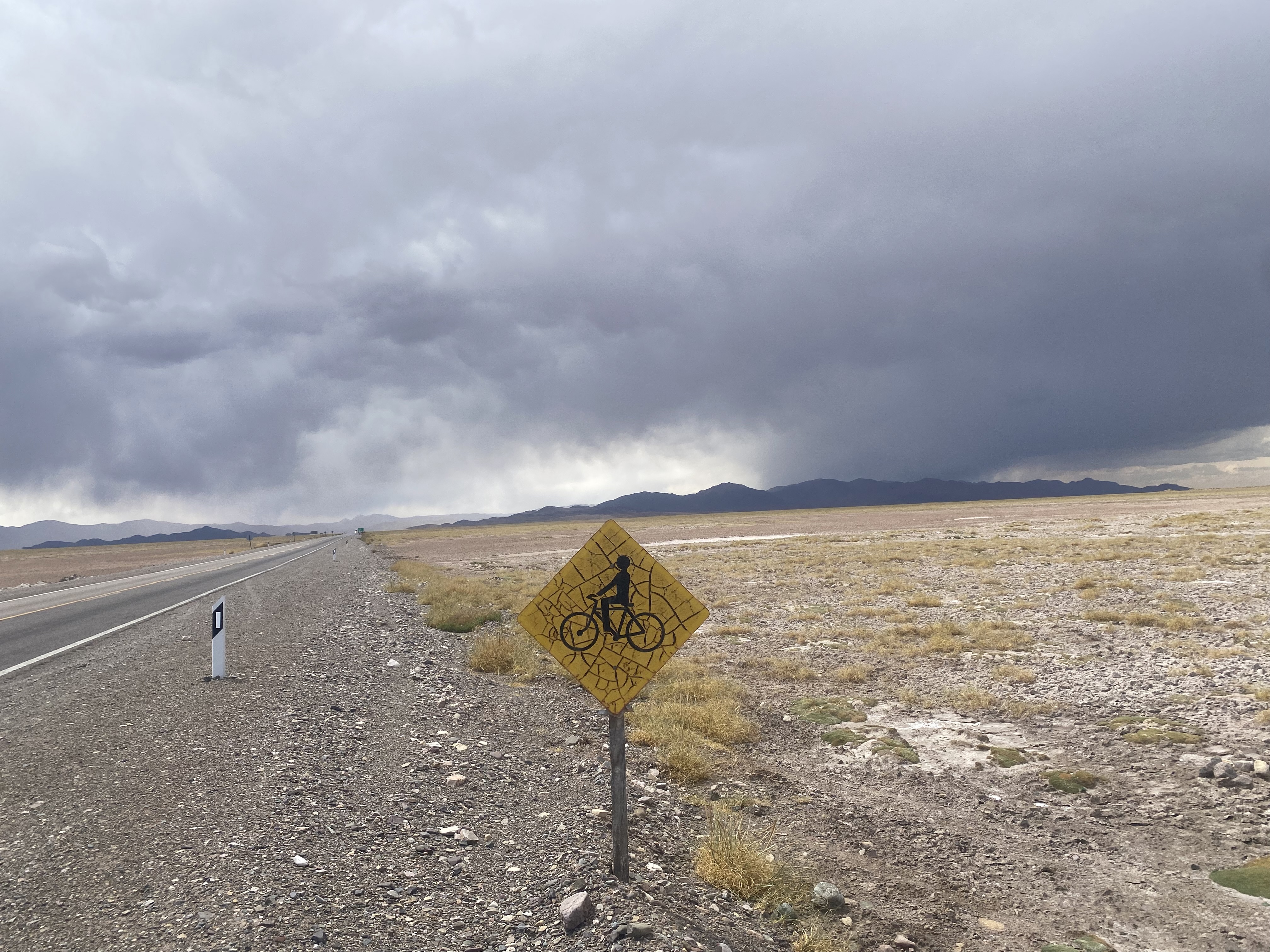 Nach einem kurzen Zwischenstopp in Salta fahren wir Richtung Nordwesten und durchqueren dabei die Salinas Grandes auf einer Höhe von 3500 Metern über Meer. Von den Anden her zieht ein Gewitter hinter uns her, weshalb wir uns beeilen, rechtzeitig in Sicherheit zu gelangen. Mit dem Velo möchten wir in einer solchen Situation definitiv nicht unterwegs sein.
