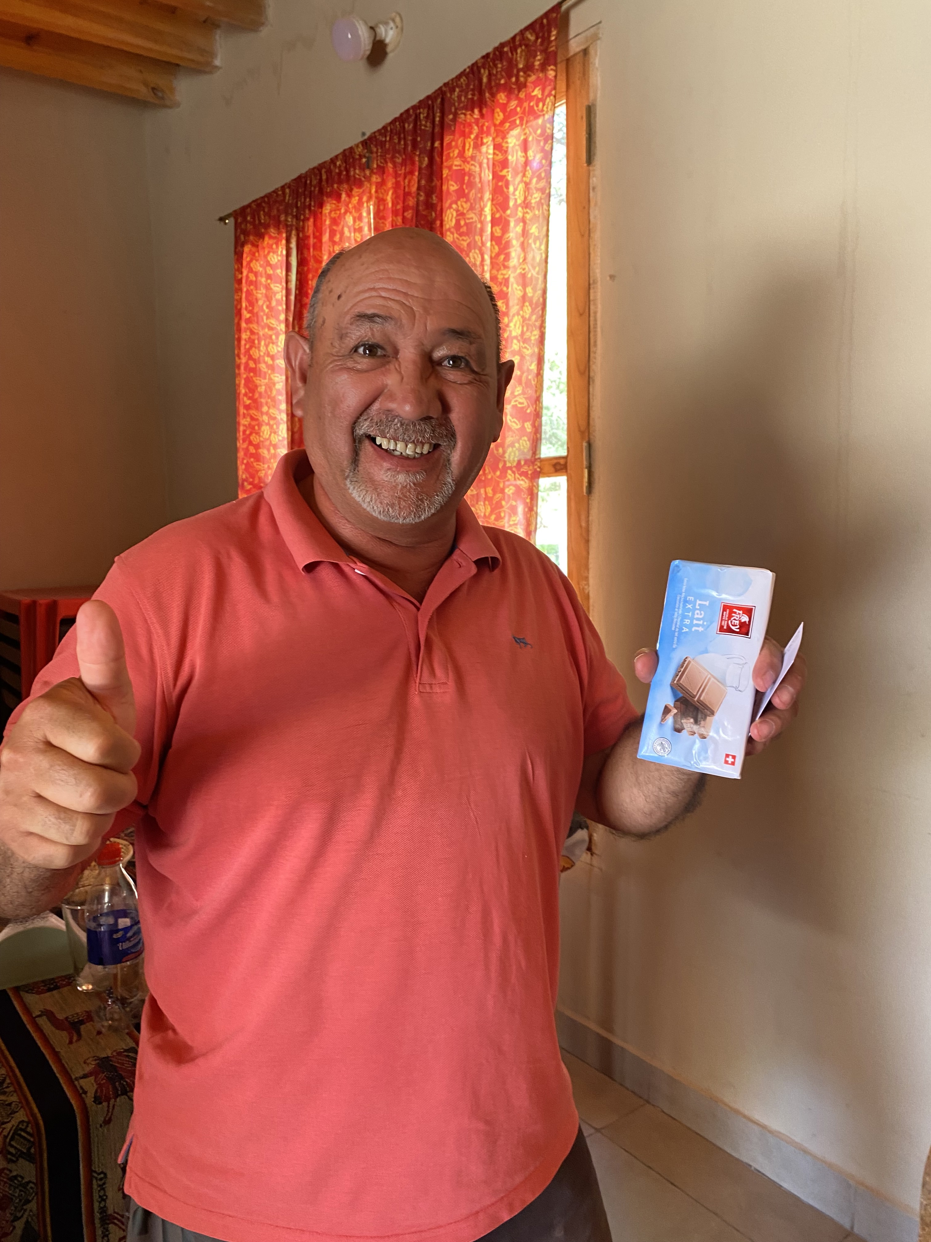 Nach der Tour schenken wir unserem Guide Tony eine unserer letzten Schokoladentafeln aus der Schweiz. Seine Freude ist riesengross, und wir sind uns nicht sicher, ob er sie wirklich mit seiner Familie teilen wird …