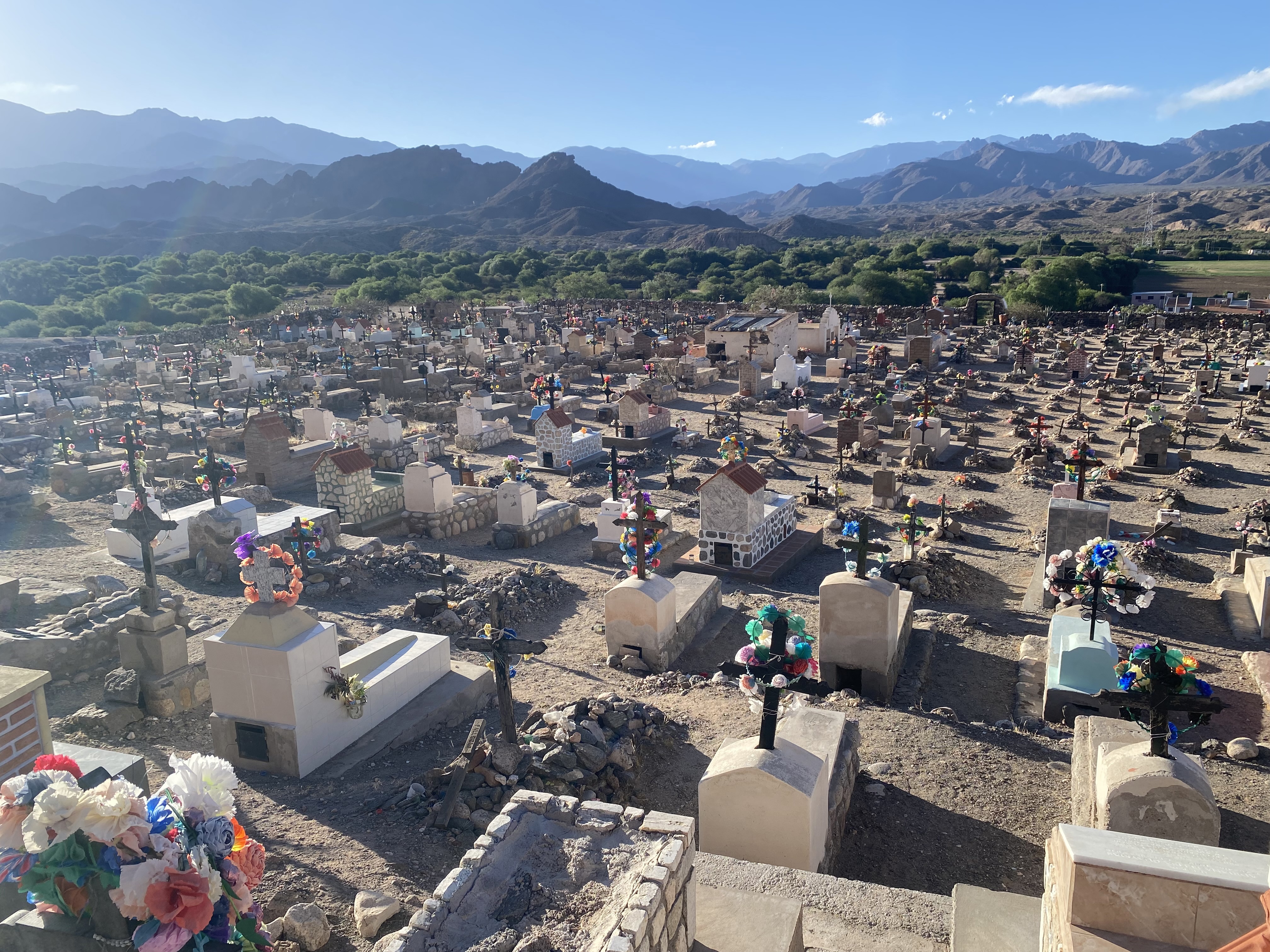 Nach unserer Ankunft in Molinos erkunden wir das kleine Dörfchen und steigen zum Friedhof hinauf. Die zahlreichen farbigen Plastikblumen bilden einen schönen Kontrast zur Weite der Landschaft und zu den Ausläufern der Andenkette.