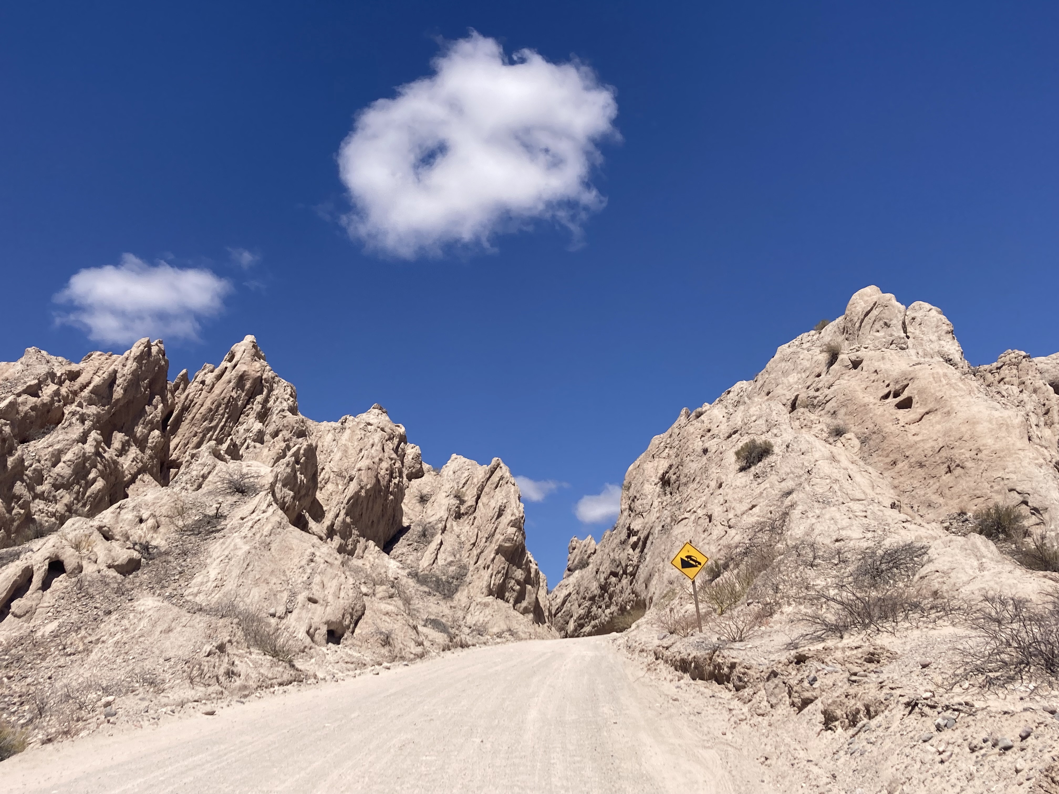 Schon bald endet der Asphalt auf der Ruta 40, doch die Schotterpiste ist gut befahrbar. Die Landschaft wechselt ab zwischen Landwirtschaftszonen, ausgetrockneten Flussbetten und Felsenschluchten, die wir vorsichtig durchqueren. Der Gegenverkehr hält sich in Grenzen und kündigt sich meist schon weit im Voraus mit einer Staubwolke an.