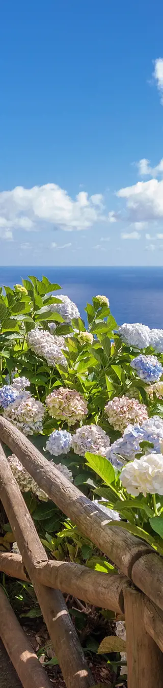 Im stetigen Auf und Ab folgen wir von Lajedo aus dem alten Verbindungsweg an der Südwestküste. Unser Blick schweift über Küstenhänge, die von Weiden mit unzähligen Hortensienhecken überzogen sind. Wir passieren die hübschen Dörfer Mosteiros und Fajãzinha, deren Dorfplätze zur Rast einladen.
