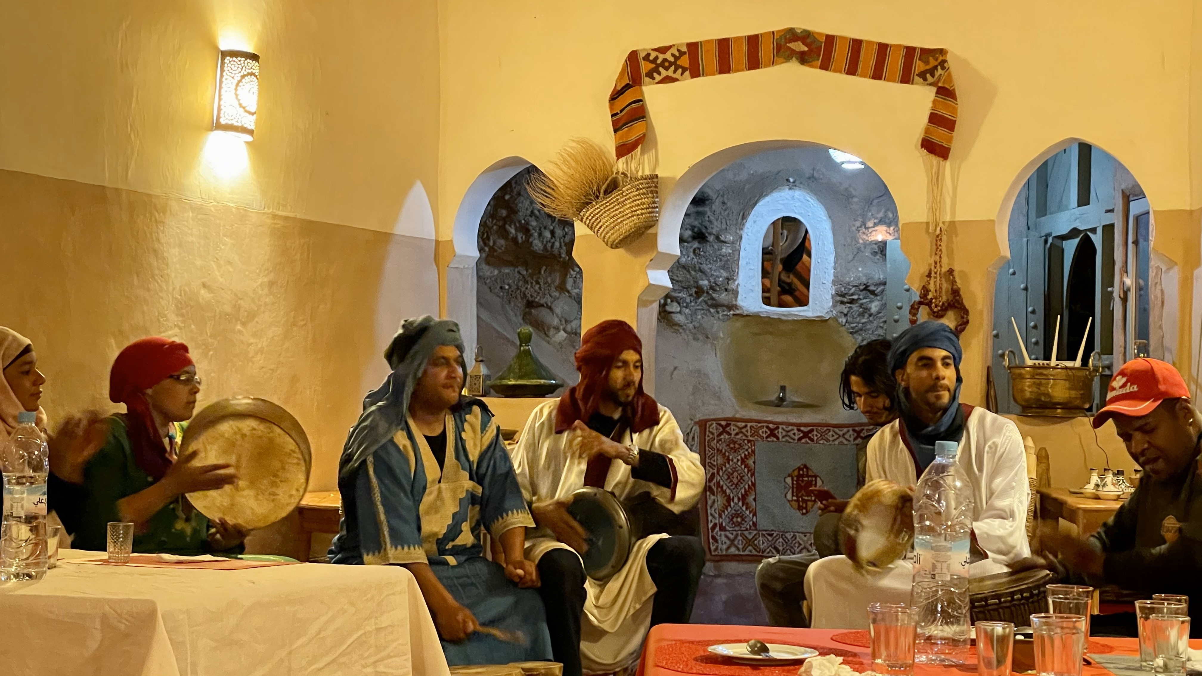 Wir übernachten in einer wunderschönen umgebauten Kasbah, schnabulieren eine köstliche marokkanische Tagine und kriegen zum Dessert gleich auch noch das Live-Musikprogramm geliefert. Erst sind es nur drei Angestellte, die mit unterschiedlichen Trommelinstrumenten und Gesang den Anfang machen. Nach und nach stossen weitere Einheimische dazu und der kleine Raum wird gefüllt mit Freude, Lachen und einer festlichen Stimmung, die unter die Haut geht.