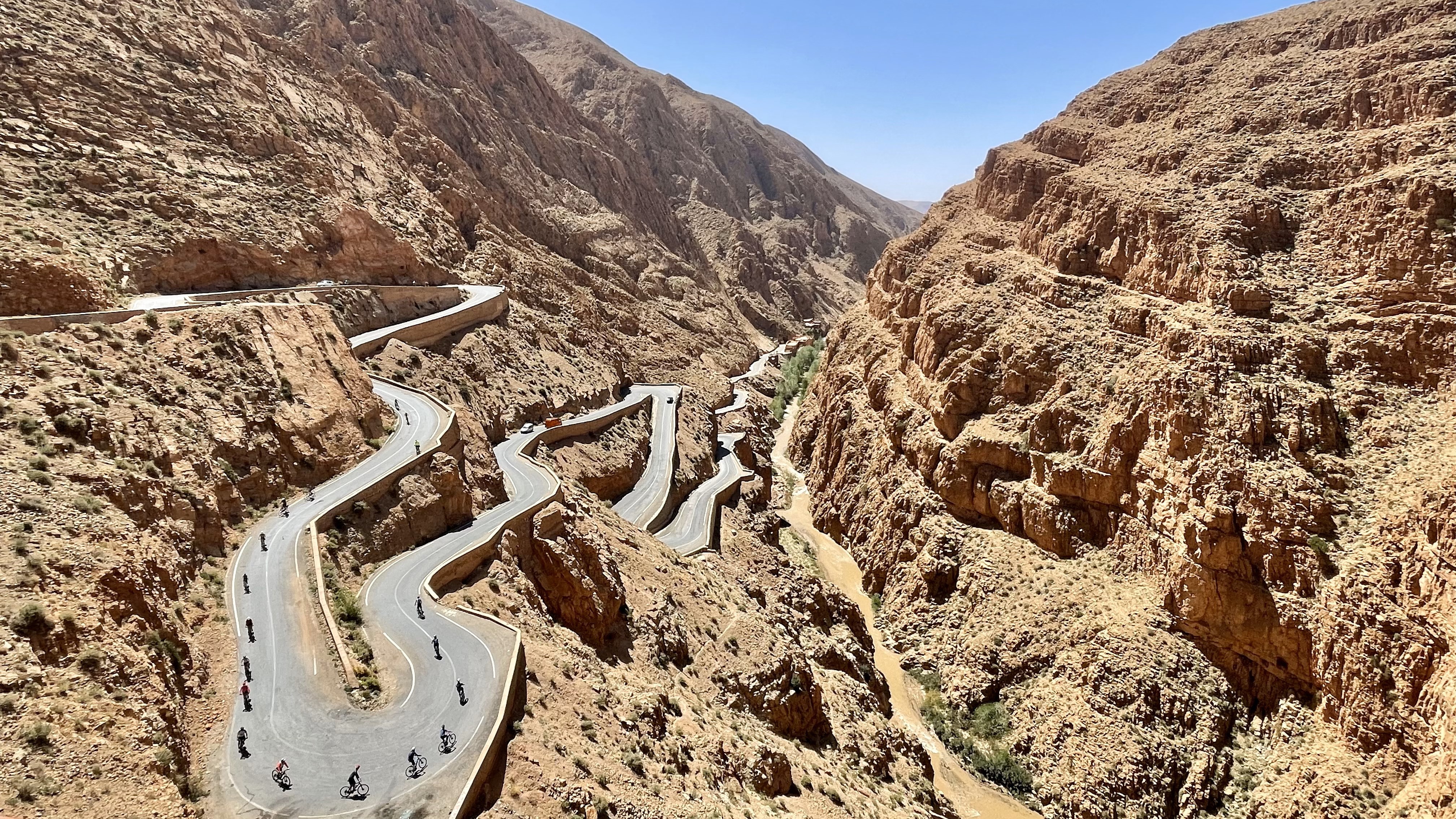 Über eine spannende Nebenstrasse gelangen wir nach Telouet, wo sich eine gut erhaltene Kasbah – ein ehemaliger Fürstenlandsitz – befindet. Ein lokaler Guide erläutert uns die eleganten Mosaike und mit Seidenstoff verzierten Wände. Ausserdem schildert er uns, welche Berühmtheiten sich hier früher aufgehalten haben. Leider wird dieses denkwürdige Gebäude beim letzten grossen Erdbeben im Herbst 2023 stark beschädigt. Eine Wiedereröffnung ist zwar geplant; ein Datum dafür ist aber noch nicht absehbar.