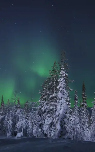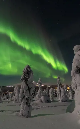 Entdecke in der Nacht das Naturschauspiel der Nordlichter in Kombination mit der tief verschneiten Landschaft des Pallas-Yllästunturi-Nationalpark