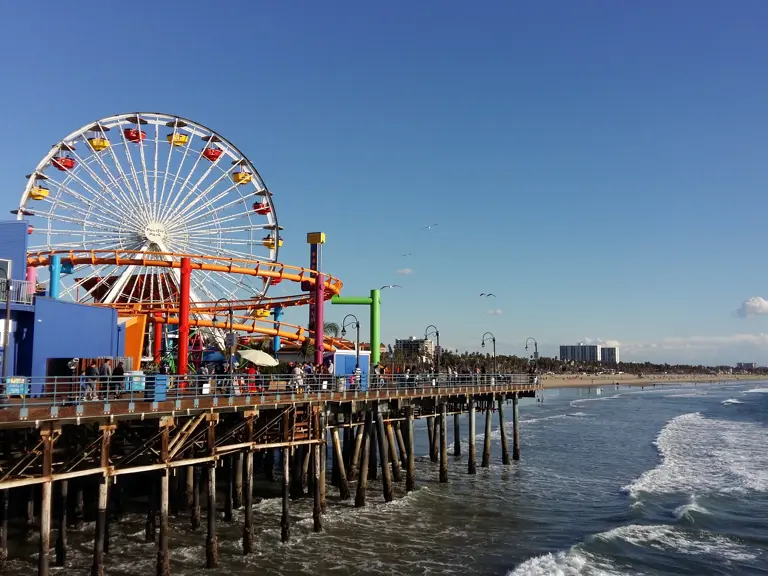 Schlendere zum Sonnenuntergang den Santa Monica Pier entlang und geniesse das Naturschauspiel. Genau an dieser Stelle gibt es noch einen Vergnügungspark namens «Pacific Park», verschiedene Imbiss-Stände und Modeschmuckläden sowie eine breite Fläche des goldenen Sandes, der sich kilometerweit an der Küste entlangzieht.