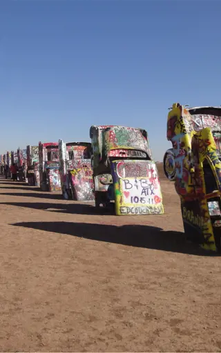 Im ehemaligen Gebiet des Volks der Cheyenne triffst du auf die berühmte «Cadillac Ranch», eine Kunstinstallation in der Nähe von Amarillo. Hier sind 10 alte Karossen bis zur Hälfte im Sand begraben, die für die Freiheit, die das Automobil mit sich brachte, sowie seine Faszination und Anziehungskraft stehen.