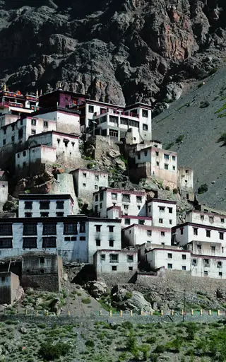 Das Kloster ist ein imposantes Bauwerk, das auf einem Hügel über das Spiti-Tal zu wachen scheint. Es ist ein tibetisch-buddhistisches Kloster und dient als Ausbildungsstätte der Lamas.