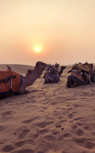 Eine Tour auf einem Kamelrücken wirkt wie eine Reise in eine andere Zeit. Wenn man über die Dünen von Jaisalmeer reitet und dabei dem Sonnenuntergang zusehen kann, wirkt dies aber noch mehr, wie ein Märchen aus 1001 Nacht.