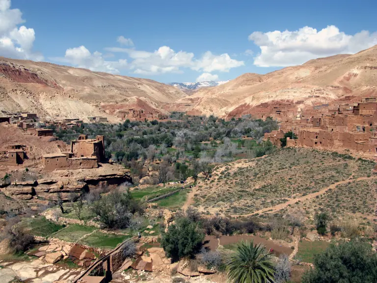 Entdecke auf deiner Reise Marokkos Sehenswürdigkeiten. Ganz am Anfang des Atlasgebirges, 200 Kilometer von Marrakesch entfernt, befindet sich das Dorf Ait Ben Haddou, in dem bereits Filmklassiker wie «Gladiator», «Jesus von Nazareth» und «Prince of Persia» gedreht wurden. Nicht umsonst ist der Dorfkern schon seit 1987 UNESCO-Weltkulturerbe. Die Lehmmauern der aneinandergereihten Häuser vereinen sich mit natürlichen Felsen und sind mit Ecktürmen und Zinnen verziert. Auf einer Reise nach Marokko ist dieses Dorf definitiv einen Besuch wert.