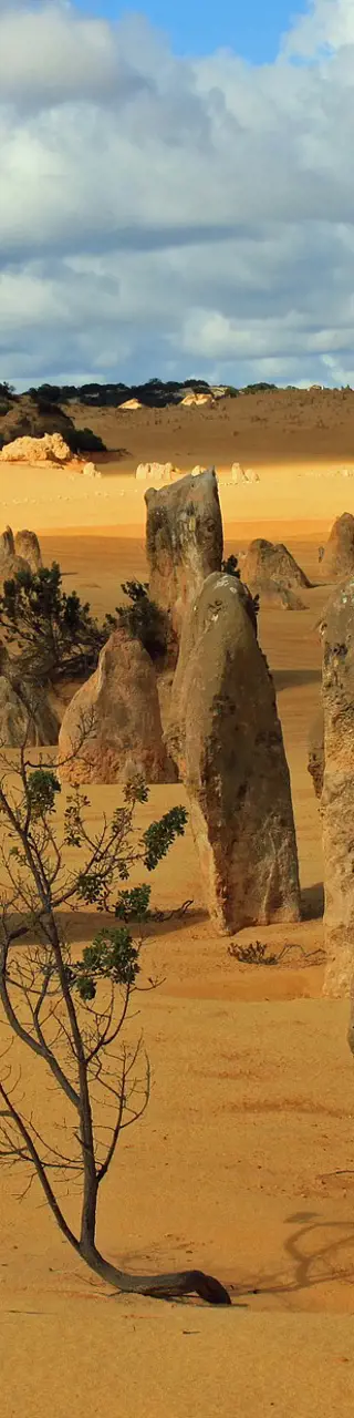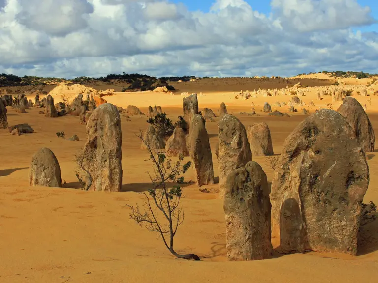 Entdecke im Nambung Nationalpark, drei Stunden nördlich von Perth, die bis zu vier Meter hohen, verwitterten Kalksteinsäulen, die in der Morgen- oder Abendsonne besonders beeindruckend sind. Egal, ob du zu Fuss oder mit dem Auto unterwegs bist, erlebe ein surreales Wunderland direkt am Meer, das dich in eine einzigartige geologische Welt entführt.