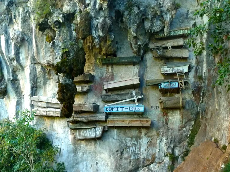 Beim Besuch des traditionellen kleinen Dorfes Sagada lernst du die Tradition der etwas skurrilen Felsenbestattung des Igirot-Stammes kennen. Sie glauben, dass die Seelen der Verstorbenen frei sind, wenn ihre Särge in luftiger Höhe an den Felswänden hängen.