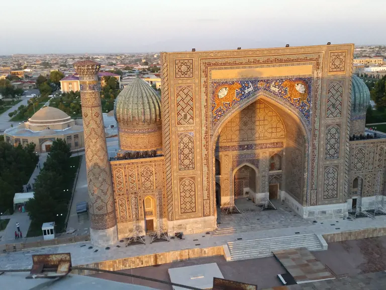 Samarkand – nur schon der Name ist wie Musik in den Ohren. Die Stadt ist eine der bekanntesten Städten auf der Seidenstrasse und empfängt dich mit ehrwürdigen Moscheen, Medressen und Mausoleen. Dabei ist der Registan das Wahrzeichen Samarkands und einer der prächtigsten Plätze Zentralasiens. Schlendere über den Registan, bestaune die Medressen – wahre Meisterwerke der Architektur Kunst– und fühle dich in der Zeit zurück versetzt. Versammlungen, Händler mit ihren Tieren und wertvollen Waren, Festlichkeiten und Verkündungen fanden hier statt. Speziell märchenhaft präsentiert sich der Registan, wenn das Licht der Morgen- oder Abendsonne dieses kunstvolle Werk in ein sanftes gelb-orange taucht. Und allenfalls schaffst du es sogar eines der Minarette zu erklimmen und erblickst die Abendsonne aus erhabener Höhe.